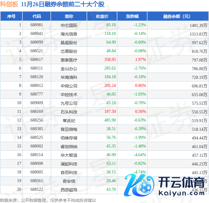 科创板融券余额前三分辩为:中芯海外(688981)融券余额1481.39万元、海光信息(688041)融券余额1313.83万元、晶晨股份(688099)融券余额997.62万元,前20具体见下表: