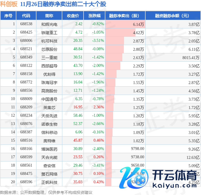 科创板融券净卖出前三分辩为:和辉光电(688538)融券净卖出6.14万股、铁建重工(688425)融券净卖出4.62万股、杭可科技(688006)融券净卖出2.87万股,前20具体见下表: