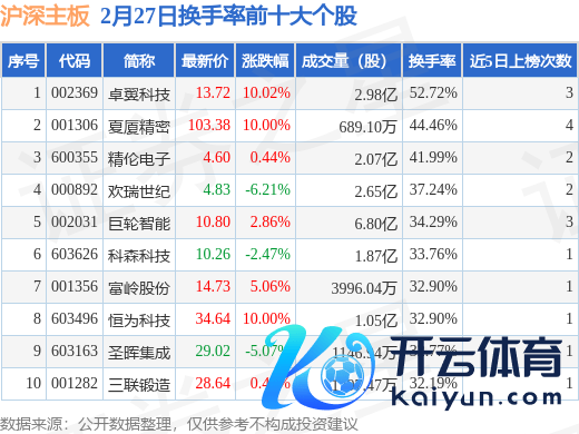 当日沪深主板换手率前10大个股中7只个股收涨,平均涨幅5.55%,其中卓翼科技(维权)(002369)以换手率52.72%排第一,5只个股近5个往将来中屡次上榜。
